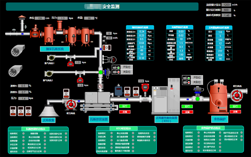 在我们的云平台,可以针对项目做对应的应用场景组态界面,布置组态内容设备运行的动画,可以清晰的读取各采集点的实时数据,了解设备的运行状态,如下图所示: