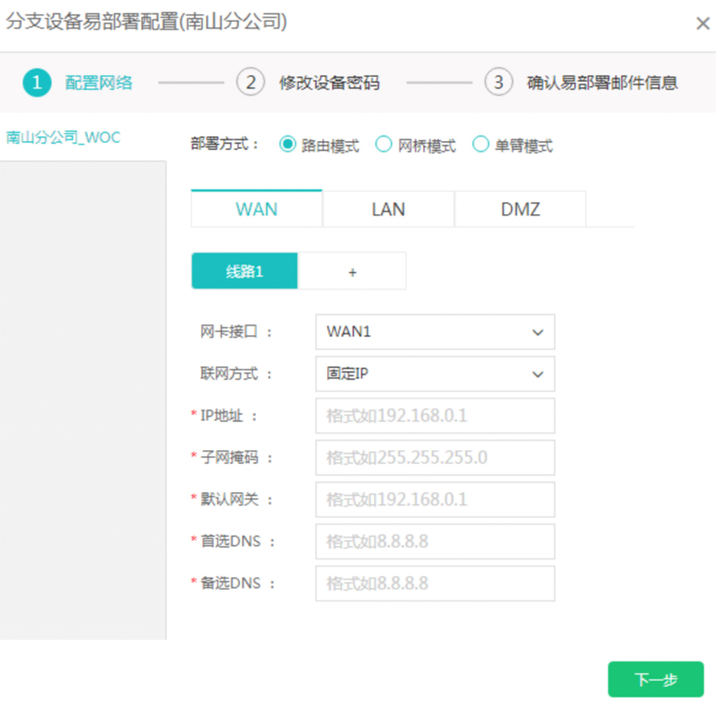 深信服SD-WAN易部署采用了邮件开局方式,支持在总部端提前配置好分支基础网络、总部接入等信息,将配置加密存储在URL链接中发送给分支管理员。通过分支管理员手动点击该链接,配置将自动完成,实施的分支管理员即使没有任何IT经验,也可在邮件内容的指导下轻松完成上架部署。