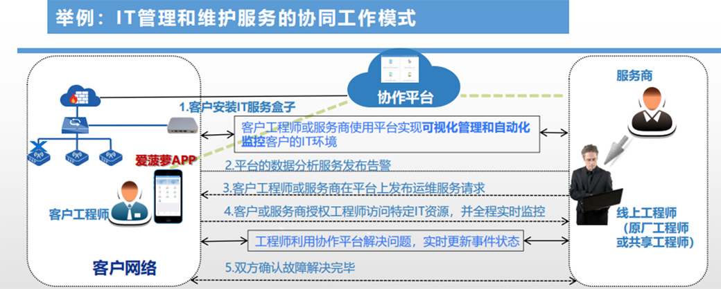 服务盒子、爱菠萝APP 是IT协作的线下工具。 lT协作平台实现IT管理和监控、事件管理、任务发布和响应、方案讨论、认证和授权、维护诊断、过程审计、支付等功能。